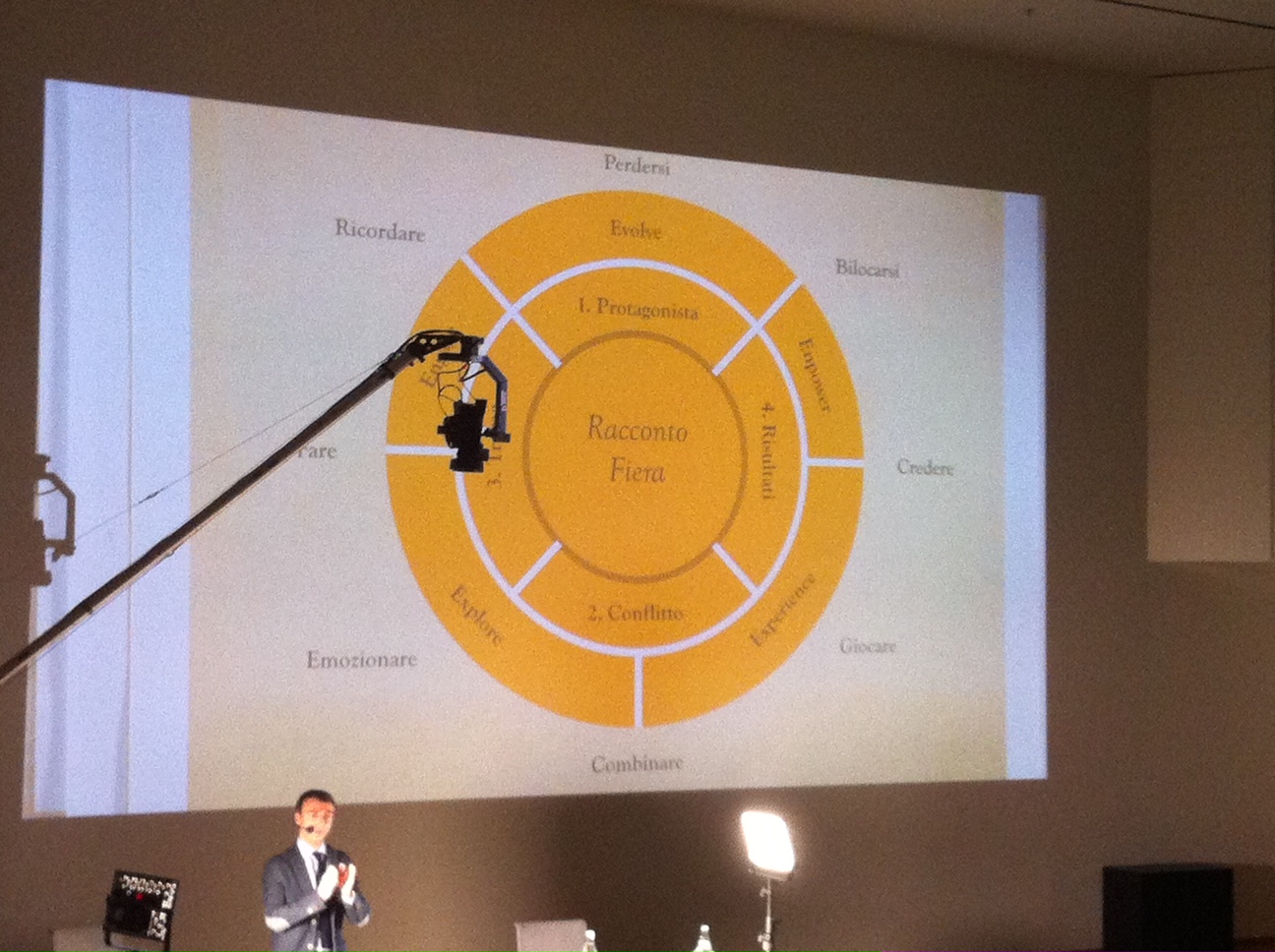 Ed anche la forma di narrazione della conferenza è stata una esperienza di storytelling: via le slide, sì ad una telecamera in posizione zenitale, che riprende il tavolo sul quale Andrea Fontana mostra oggetti, fogli e foto che vengono proiettati sul mega-schermo alle sue spalle.